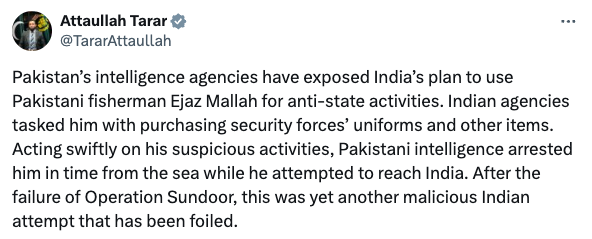 “Pakistan’s intelligence agencies have exposed India’s plan to use Pakistani fisherman Ejaz Mallah for anti-state activities. Acting swiftly, our agencies arrested him in time from the sea while he attempted to reach India. Another Indian plot has failed. #IndiaFailed”