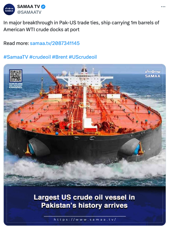 Karachi, October 30, 2025 — Pakistan has received its first-ever shipment of crude oil from the United States, a development seen as a landmark in the country’s evolving energy landscape and expanding trade partnership with Washington.