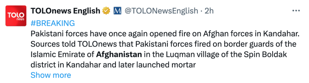Reports from Afghan media, including TOLO News, claimed that Pakistan launched mortar strikes twice in Spin Boldak, Kandahar. However, Pakistan maintains that its forces acted solely in response to ceasefire violations, and no Afghan national forces were engaged. Taliban forces reportedly did not retaliate, remaining committed to the ceasefire.