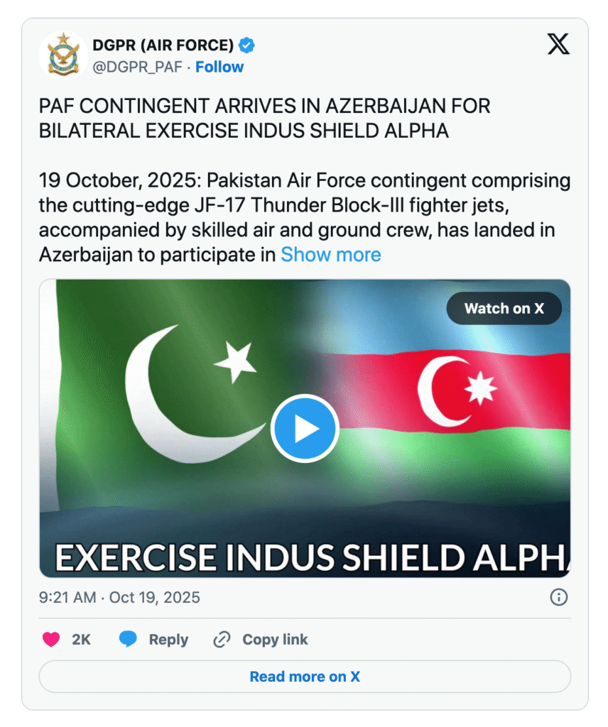 “PAF contingent arrives in Azerbaijan for bilateral exercise Indus Shield Alpha. Pakistan Air Force contingent comprising the cutting-edge JF-17 Thunder Block-III fighter jets, accompanied by skilled air and ground crew, has landed in Azerbaijan to participate in the exercise.”