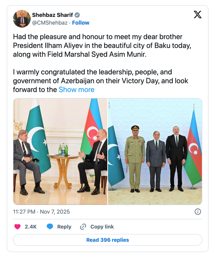 The minister’s remarks came in response to a post by Pakistan’s Embassy in Baku, which highlighted Prime Minister Shehbaz Sharif’s visit to Azerbaijan to attend the celebrations. The prime minister arrived a day earlier to participate in the Victory Day festivities, where he attended a joint dinner with Azerbaijan’s President Ilham Aliyev.