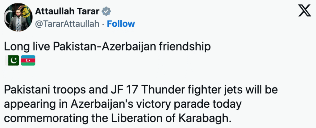 “Long live Pakistan-Azerbaijan friendship. Pakistani troops and JF-17 Thunder fighter jets will be appearing in Azerbaijan’s victory parade today, commemorating the liberation of Karabagh,” Information Minister Attaullah Tarar stated on X (formerly Twitter).